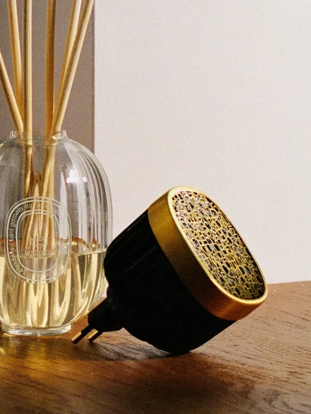 simply press to release the perfume. this electric diffuser uses the air itself to deliver the notes of nine iconic diptyque scents.