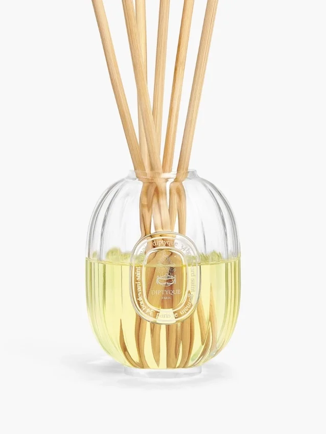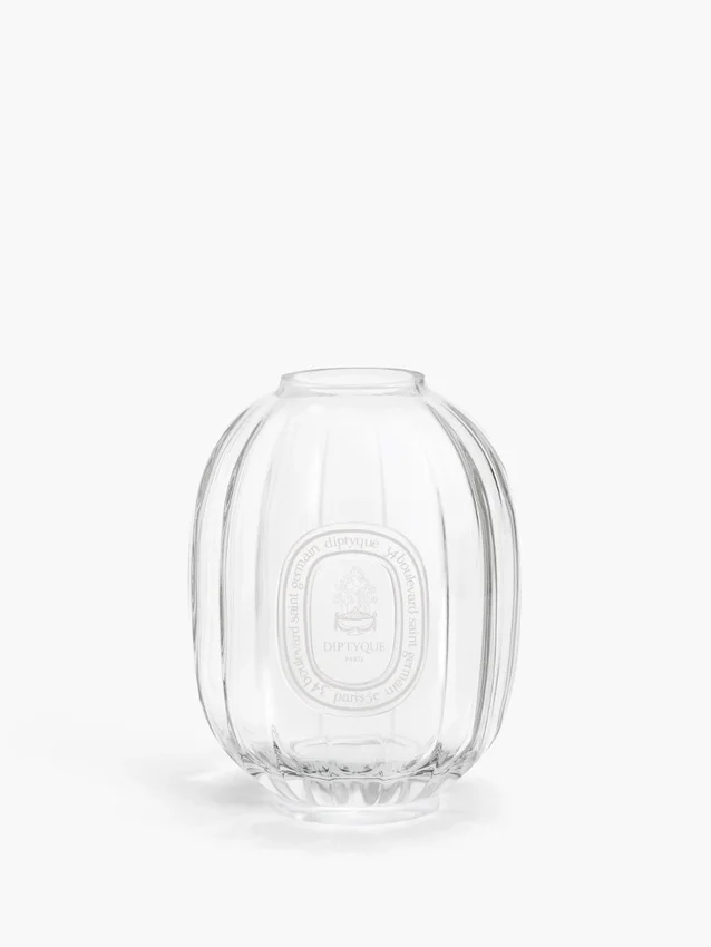 Featuring the Diptyque insignia, this small, oval-shaped vessel in faceted glass reveals scent with a prismatic appeal.