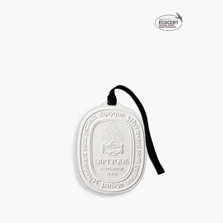 this white porcelain medallion, whose shape mirrors diptyque’s emblematic oval, can be hung in a wardrobe or tucked inside a drawer. it perfumes these intimate spaces with warm, dense notes of cedarwood and brighter accords of lavender – scents known to b